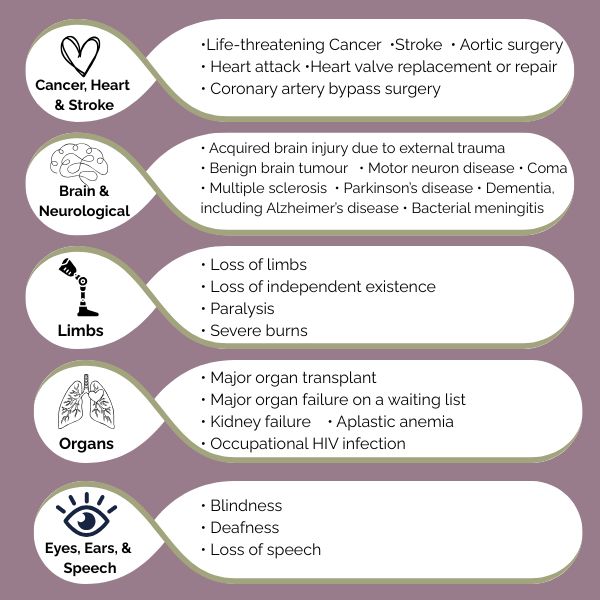 [The list may vary from one insurance company to another. It’s also important to note that each illness has a criteria/definition to qualify for full payout through your Critical Illness coverage.]